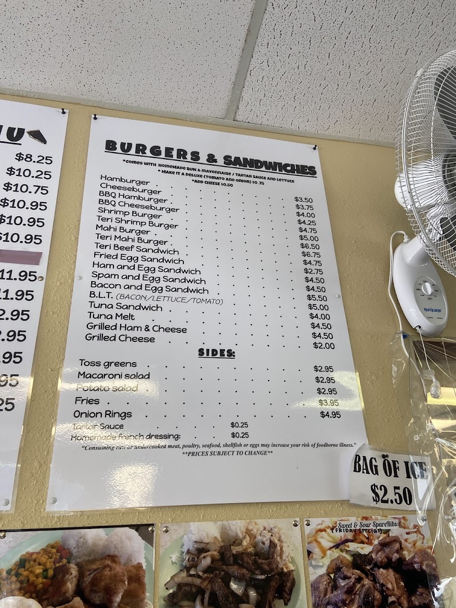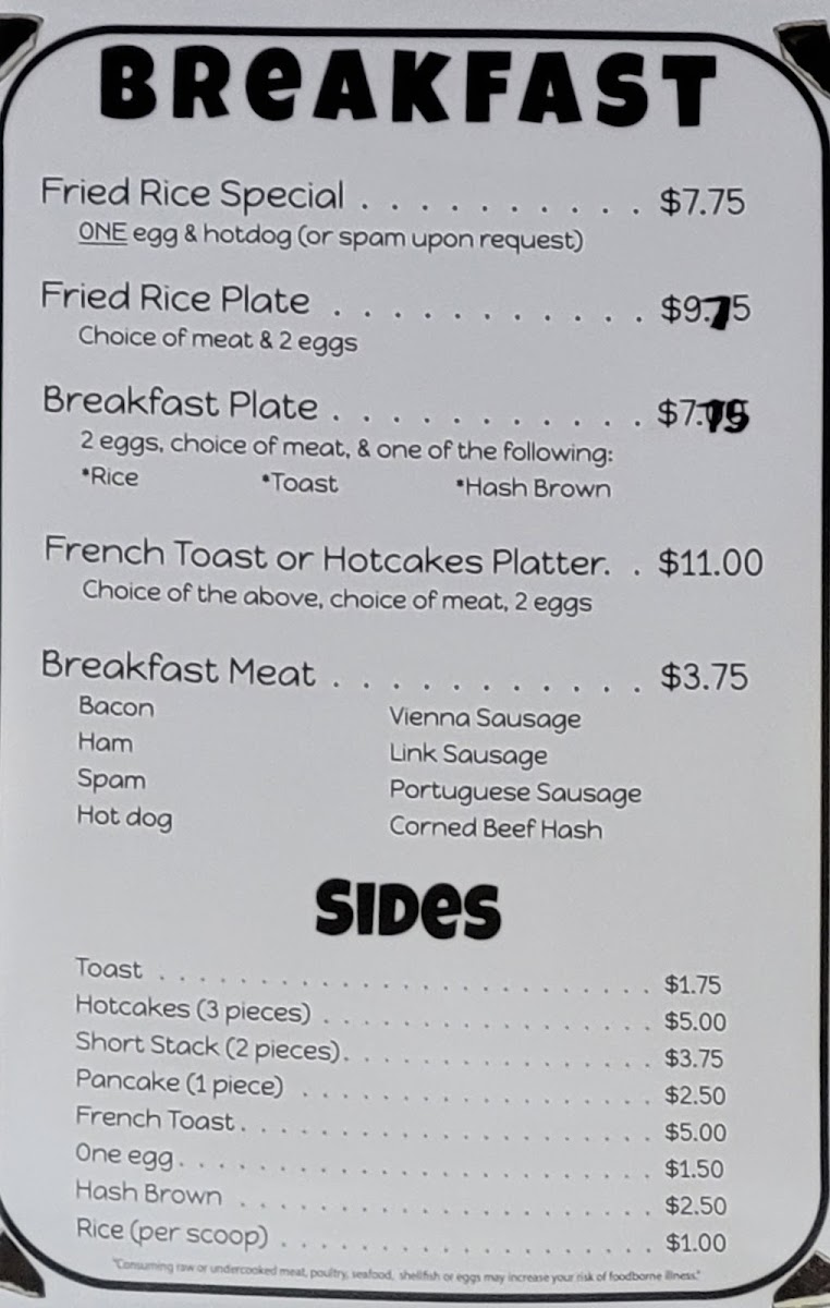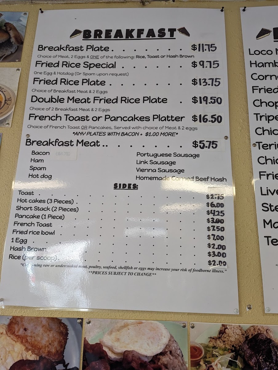 - Breakfast: This section includes options such as Fried Rice Special and Fried Rice Plate, both served with eggs and a choice of meats like hot dogs or Spam. Pancake stacks are also available, alongside sides of breakfast meats including bacon, Portuguese sausage, and ham.