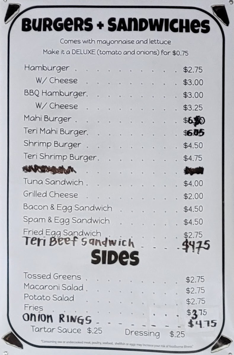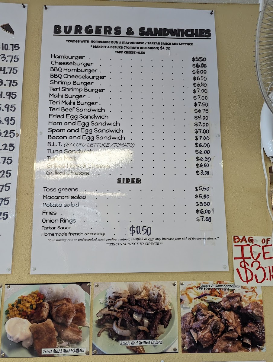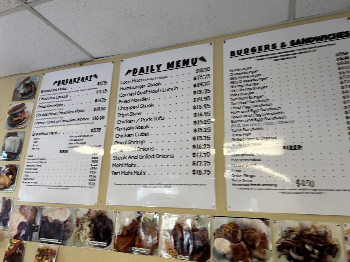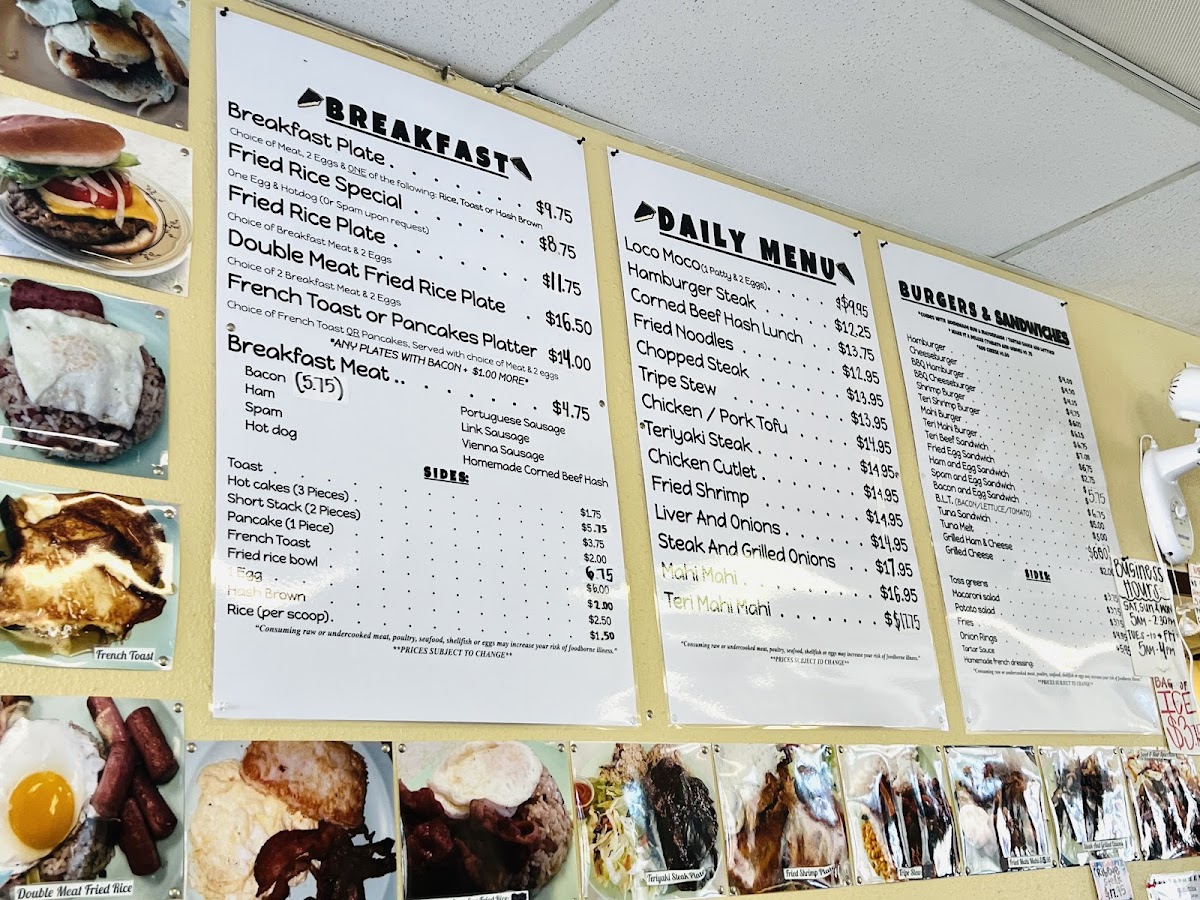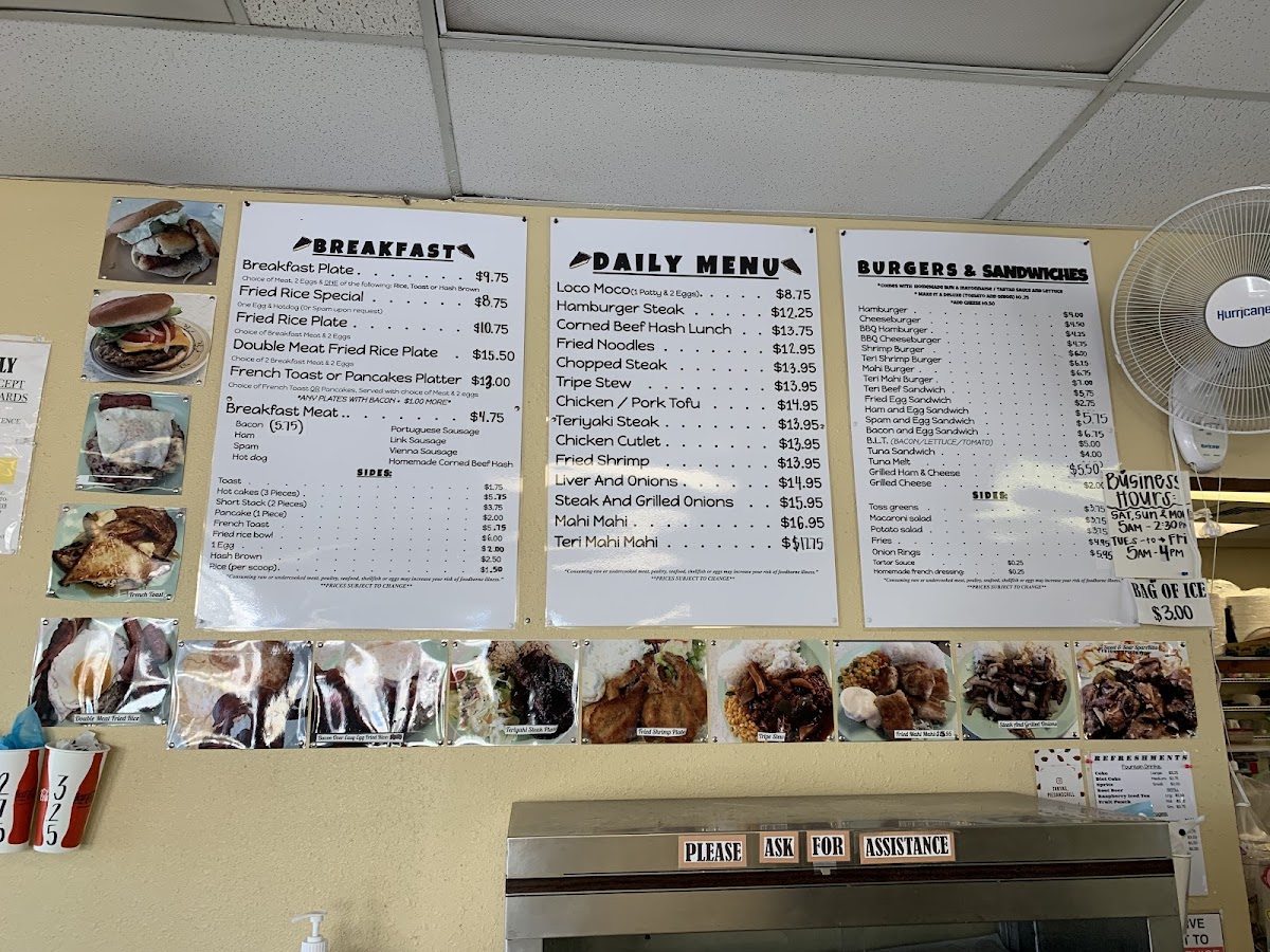 - Lunch: Lunch items include popular local plates such as Hamburger Steak served with rice and gravy, Loco Moco (a hamburger patty with egg and rice smothered in gravy), Chicken Cutlet with mixed vegetables and gravy, and Steak & Grilled Onions paired with rice and macaroni salad.