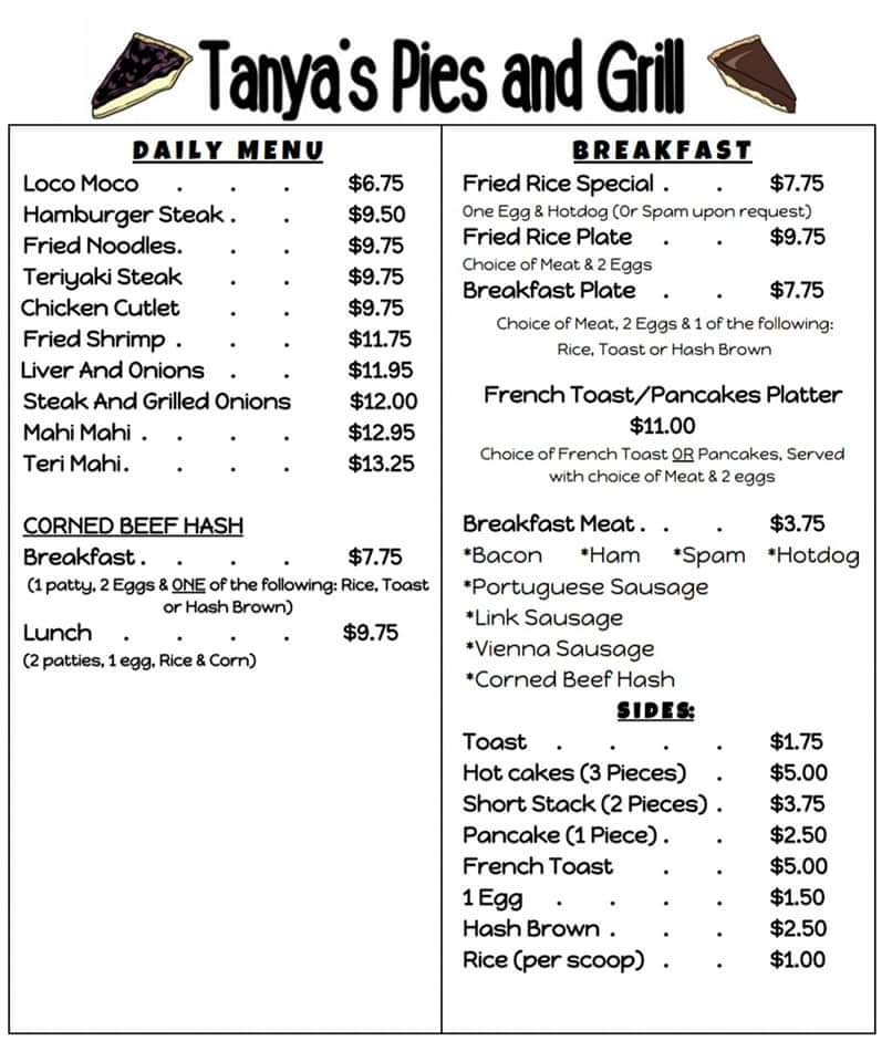 The menu at Tanya's Pies and Grill features a range of traditional Hawaiian and local-style dishes, suitable for breakfast, lunch, and casual dining throughout the day. The offerings include hearty meal plates, pies, and familiar comfort foods that reflect local flavors and preferences.
