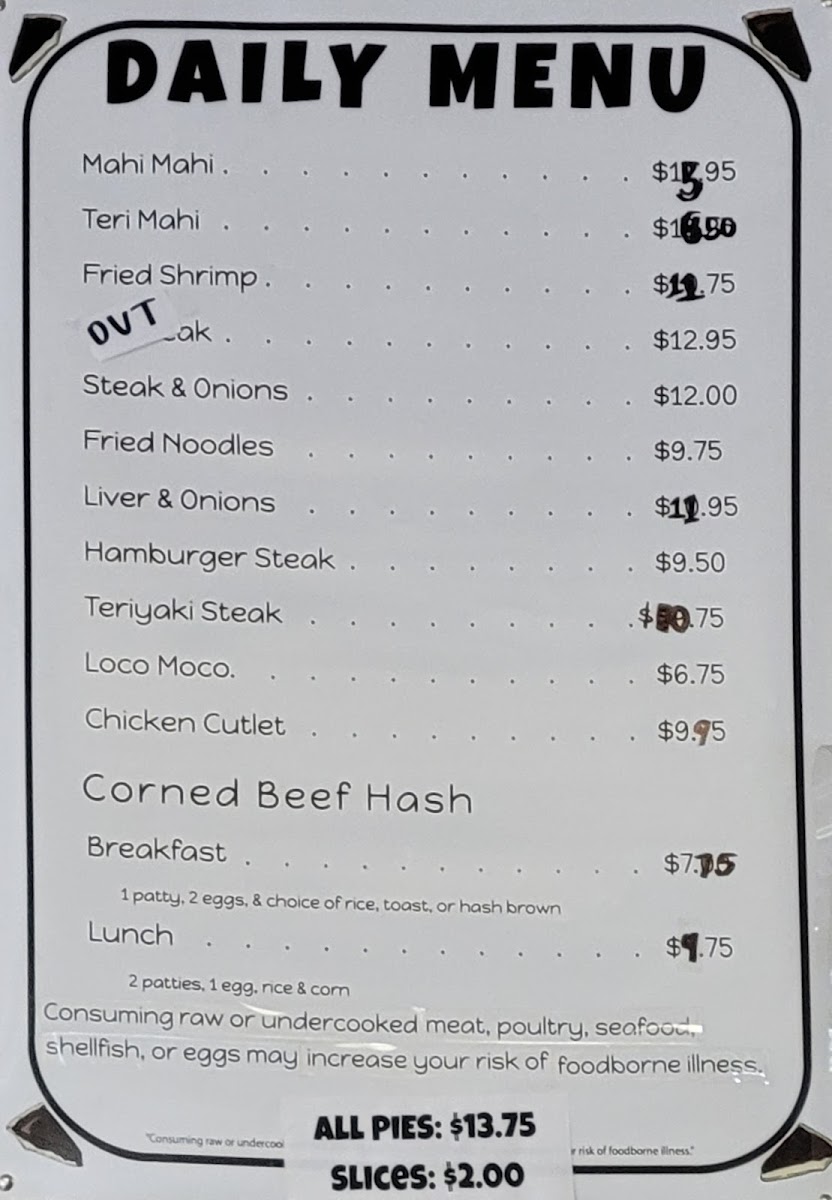 This menu serves customers looking for local-style breakfast items, satisfying lunch plates, and pie desserts, making it suitable for casual, sit-down meals or quick orders. The food selections emphasize traditional and popular dishes found in Hawaiian local cuisine.